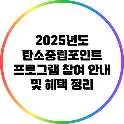 2025년도 탄소중립포인트 프로그램은 우리에게 환경을 지키고, 지속 가능한 삶을 영위할 수 있는 기회를 알려알려드리겠습니다. 지금 바로 참여 신청을 통해 자신과 미래를 위한 첫걸음을 내딛어 보세요. 탄소중립 포인트를 통해 더욱 푸른 지구를 만드는 일에 함께하길 바랍니다!