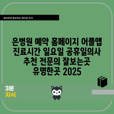 은병원 예약 홈페이지 어플앱 진료시간이 일요일과 공휴일에도 운영되어 많은 환자들에게 편리함을 알려알려드리겠습니다. 환자들이 필요할 때 언제든지 이용할 수 있도록 최상의 …